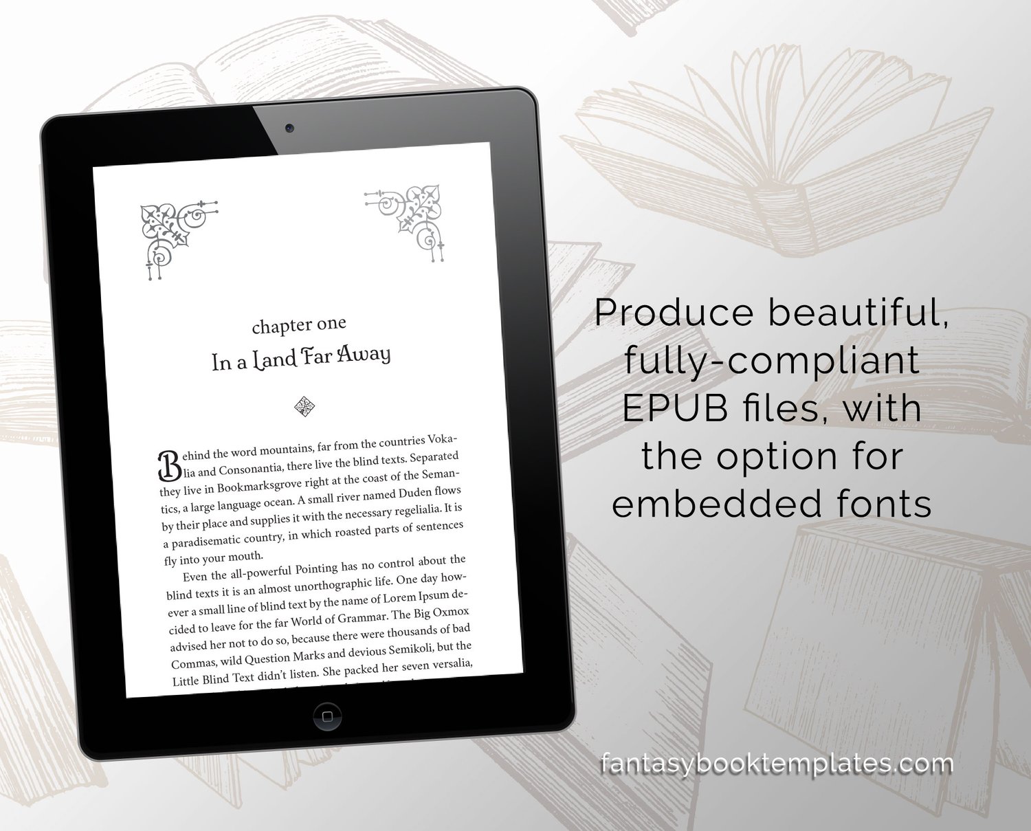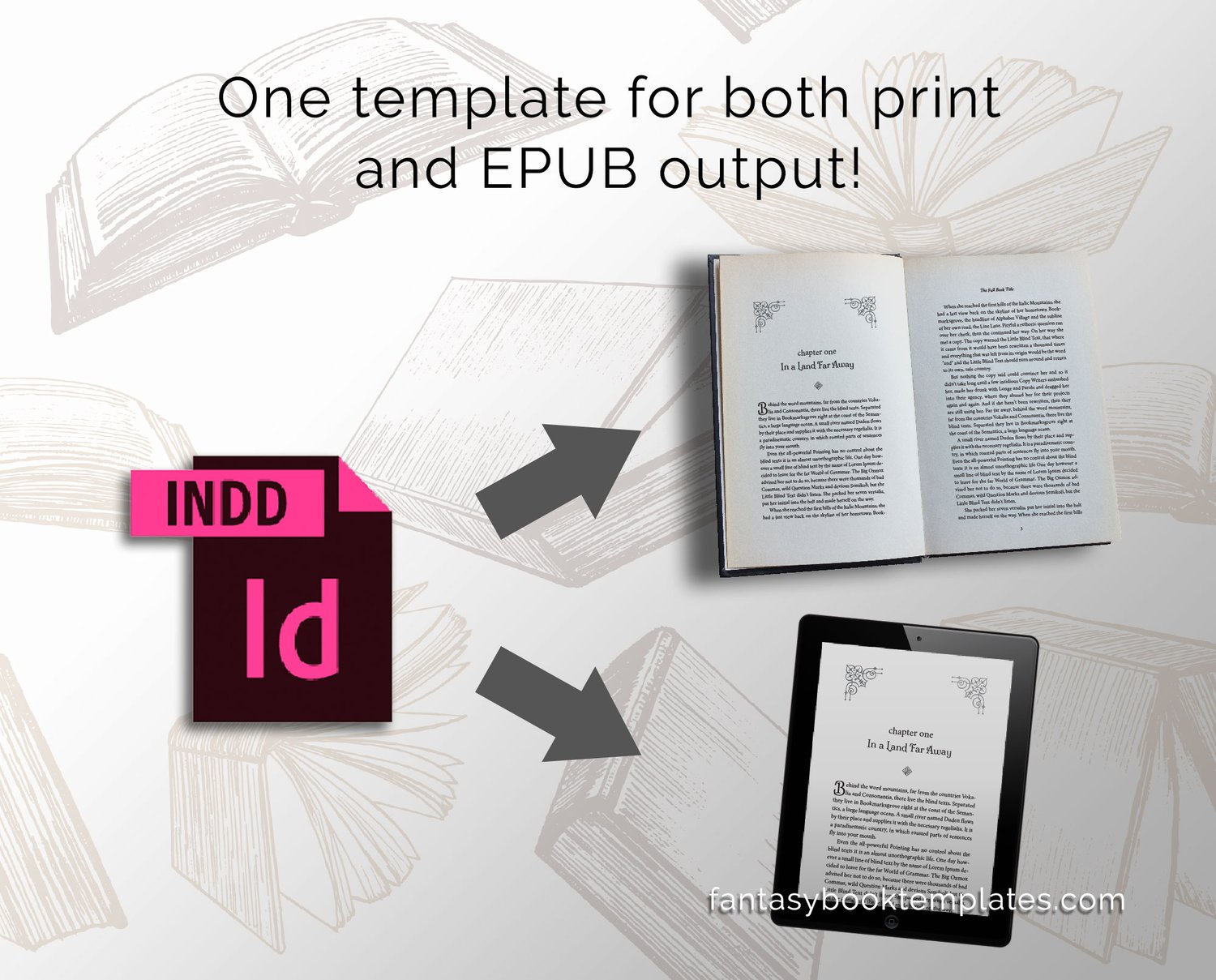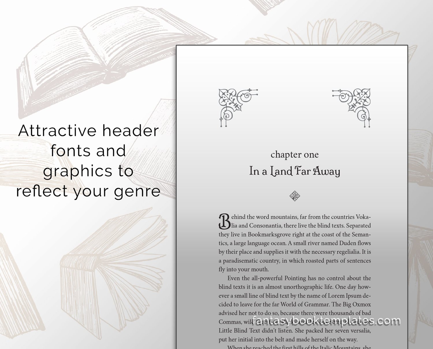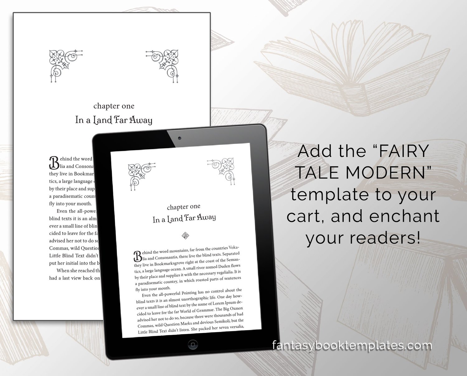 Impress your readers with a beautiful, professional fantasy book design for your next tale of elusive elves and furtive fairies! Featuring an elegant font, and intricate lace chapter image headers, “Fairy Tale Modern” is a DIY layout solution that will keep your audience engrossed right to the last page.
